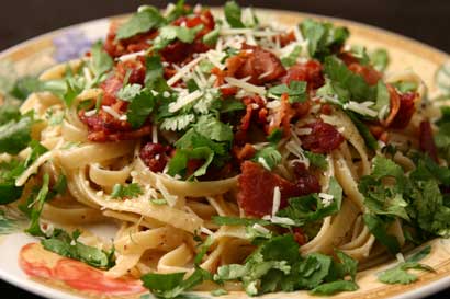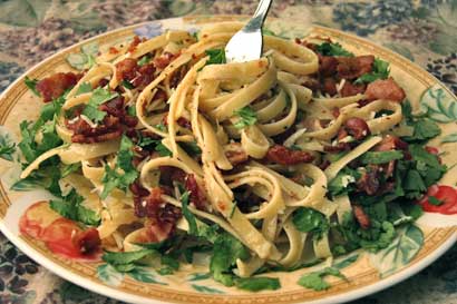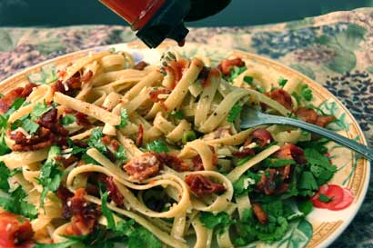 Okay, so it’s just Fetuccini Alfredo, really… with some tasty bells & whistles added for boosted comfort factor. I happen to nonchalantly whip it up for dinner while watching a